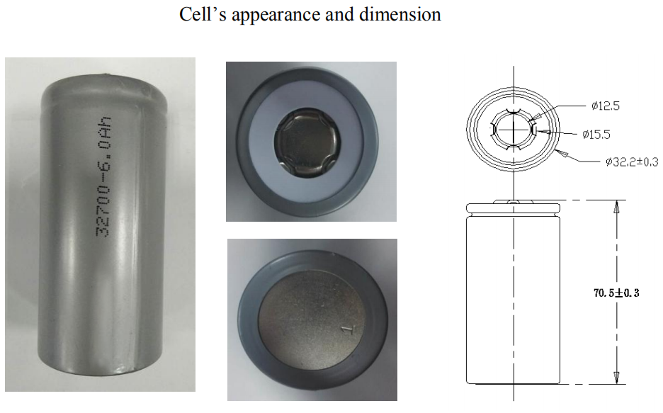 Cell SIze | ເສັ້ນຜ່າສູນກາງ: 32.2 ± 0.3mm, ສູງສຸດ 32.5mm | ຄວາມສູງ: 70.5 ± 0.3mm, Max.70.8mm |