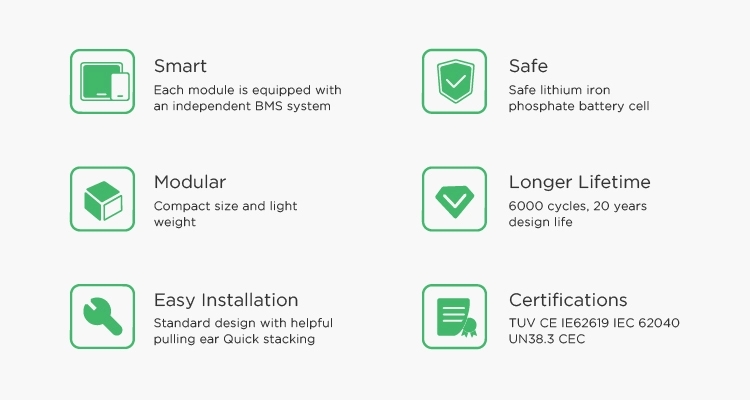 ໃບຢັ້ງຢືນແລະມາດຕະຖານຄວາມປອດໄພ | TUV / CE / EN62619 / IEC62040 / UN38.3 / CEC ຮັບຮອງ | |
